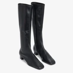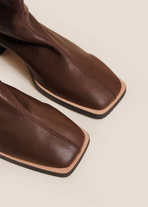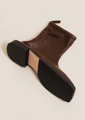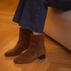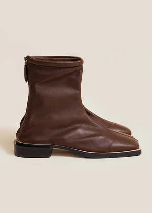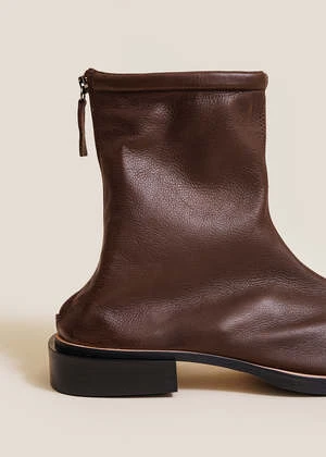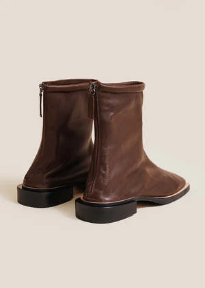 “Caoba” dark brown leather ankle boots with a wide toe and low block heel. Unlined. Features a comfortable padded footbed and zipper at back.
