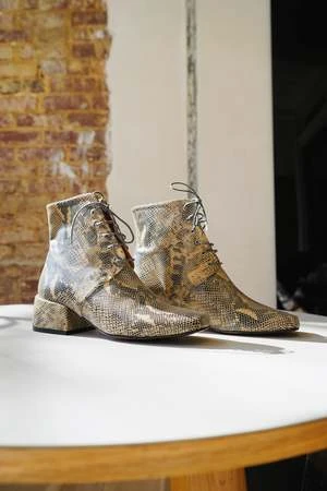 The about arianne white mamba gabriel boots are an ankle boot with black and white snake-embossed leather uppers and vegetable lining + sole. These square-toed lace-up boots have a 5 cm sturdy block heel that’s hella easy to walk in.