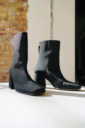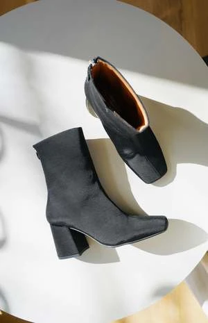 The About Arianne nico gmoire boots are a vegan black satin boot with vegetal resin soles, insoles and lining. The heel measures 7.5 cm. This style boot is our owner’s favorite shoe ever.