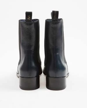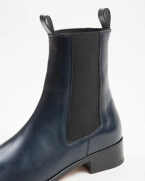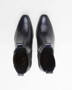 Navy Blue chelsea boots 100% natural calfskin leather with squared pointed toe. Elasticized black gusset at sides and tonal leather webbing pull-loops at collar featuring Act logo.
