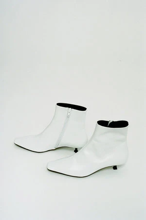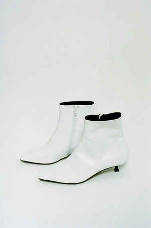 A pair of white leather ankle boots with a kitten heel and square toe. Size zip closure