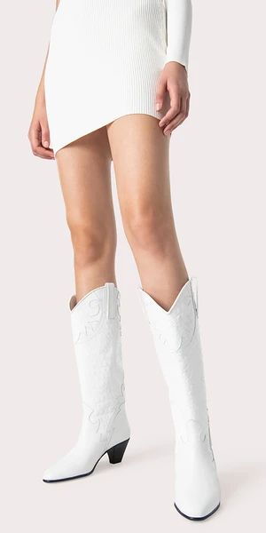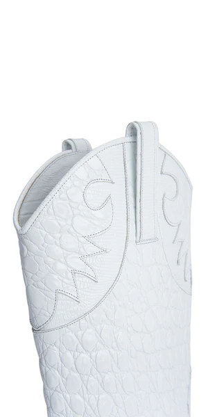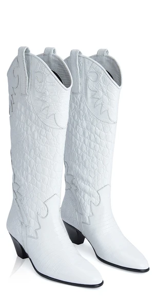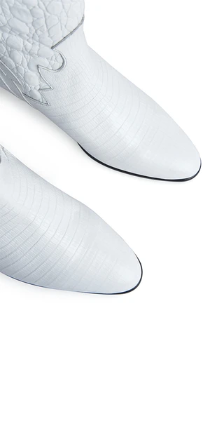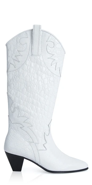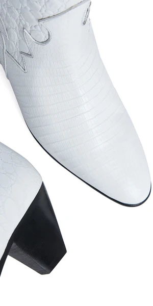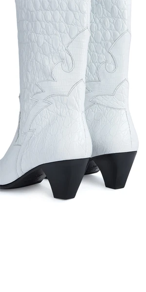 Introducing Melvin Boots from BY FAR – the perfect combination of style and comfort for any occasion. These western-style boots feature crocodile embossed leather in an optic white color, making a bold yet stylish statement that is sure to turn heads. Featuring a pull-on style with saddle straps, a Cuban heel, and decorative panelling and top stitching, these boots have it all! Plus, theyre accentuated with a curved top edge and almond toe to give them an elegant finishing touch. Whether you want to dress them up or down, wear them for a night out on the town or day-time wear, these boots are a surefire way to make your outfit stand out.