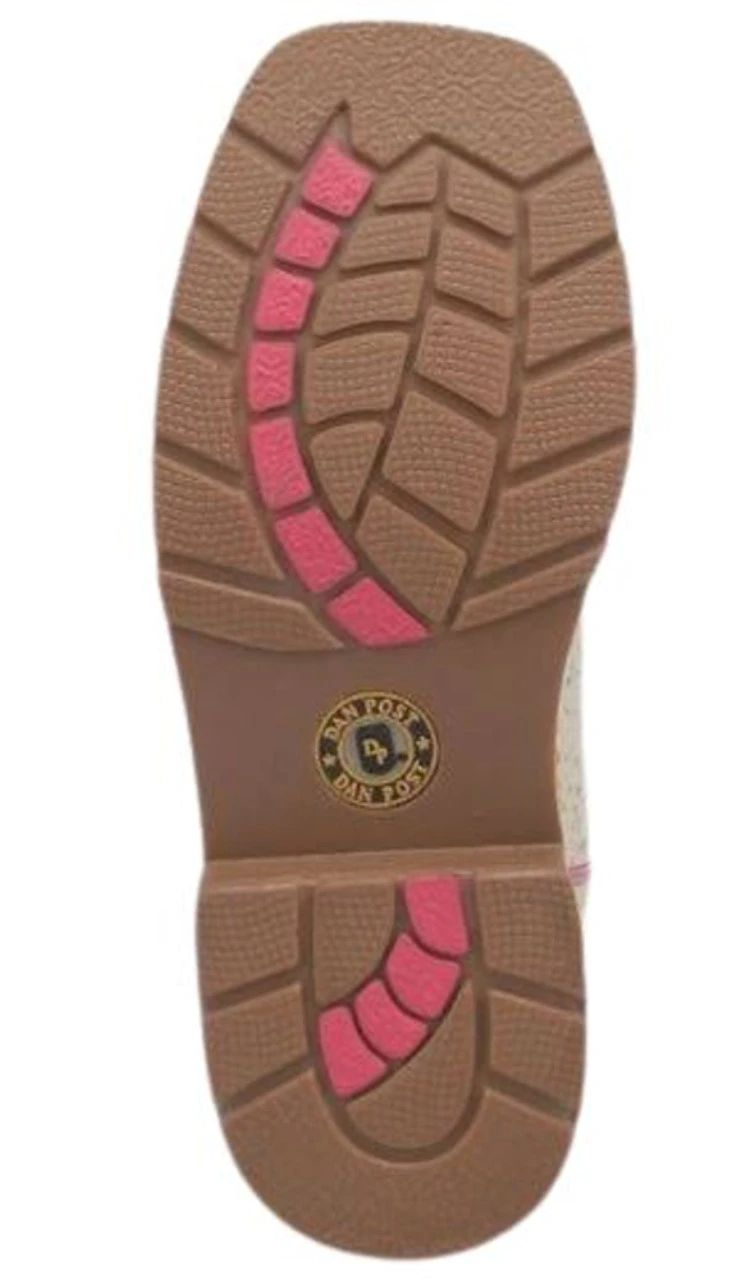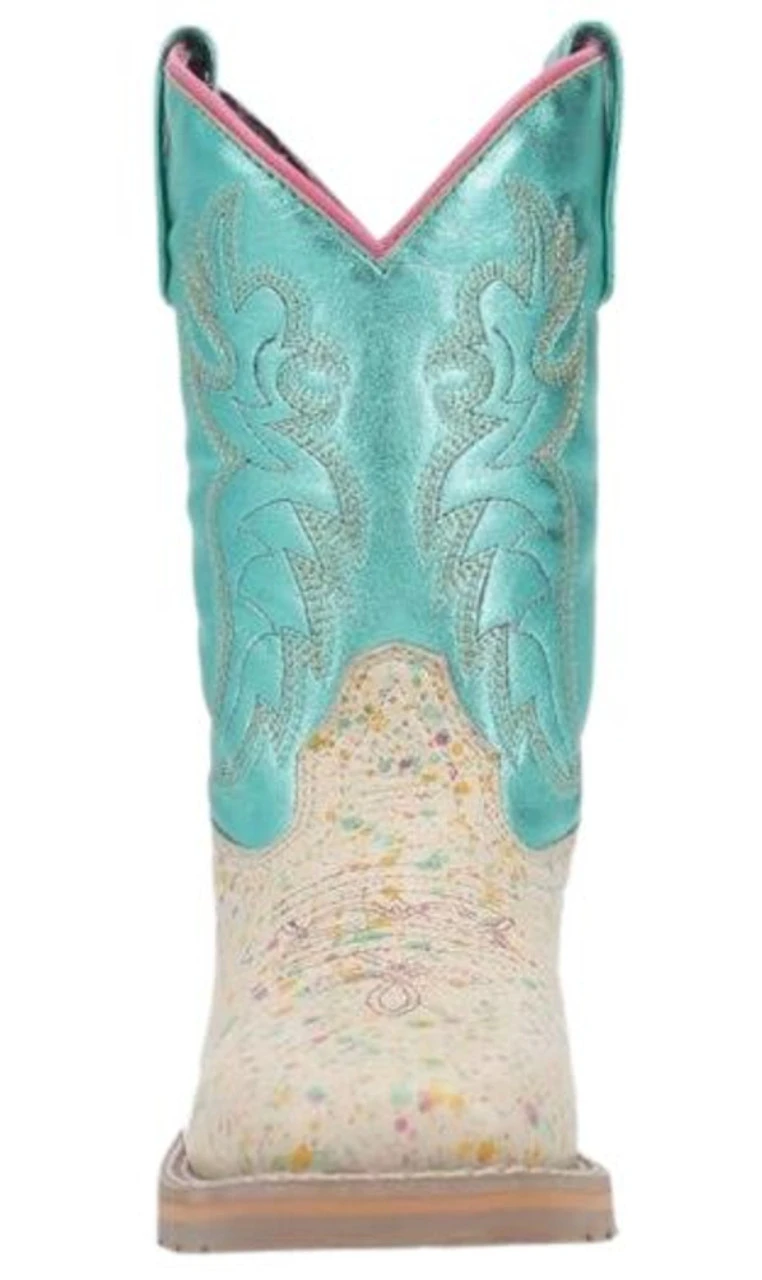 Girls Dan Post Boots: Girls Dan Post Western Cowboy Boots. Welcome Home, Cowgirl! The girlâs 8â pull on Splatt western boots from Dan Post have a square toe, and western stitch. Their bone colored splat foot with a teal shaft will help your little one stand out in the crowd! Western teal embroidery design on shaft Broad square toe Pull tabs Leather upper Rubber outsole Stockman heel Imported Double-stitched welt Spatter pattern detail Ultimate Gel-Flex footbed