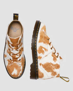 Dr. Martens restitched the subcultural classic Church 5-eye boot using an all-over Hair On leather with a distinctive cow print. The boot is detailed with brown laces and antique gold eyelets and is tagged with a signature black and yellow heel loop. The grooved outsole is secured with DMs yellow welt stitching.