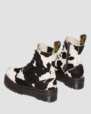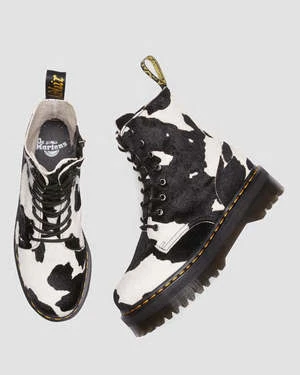 This standout rework of Dr. Martens Jadon boot is built from statement all-over Cow Print Hair On leather. The boot stands on our platform Quad sole marked with our signature grooving and yellow welt stitch. Secured with black laces and an inside zip. Tagged with a black and yellow heel loop.