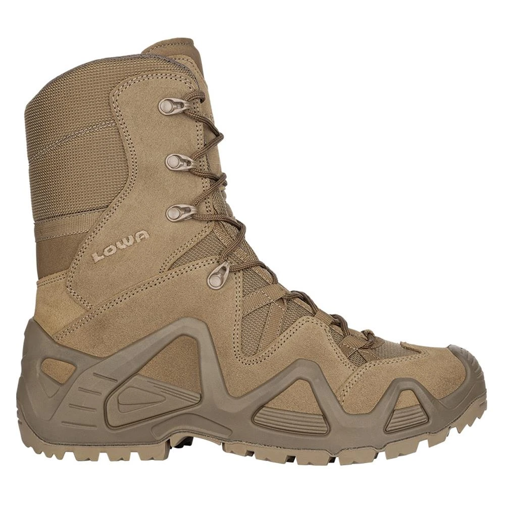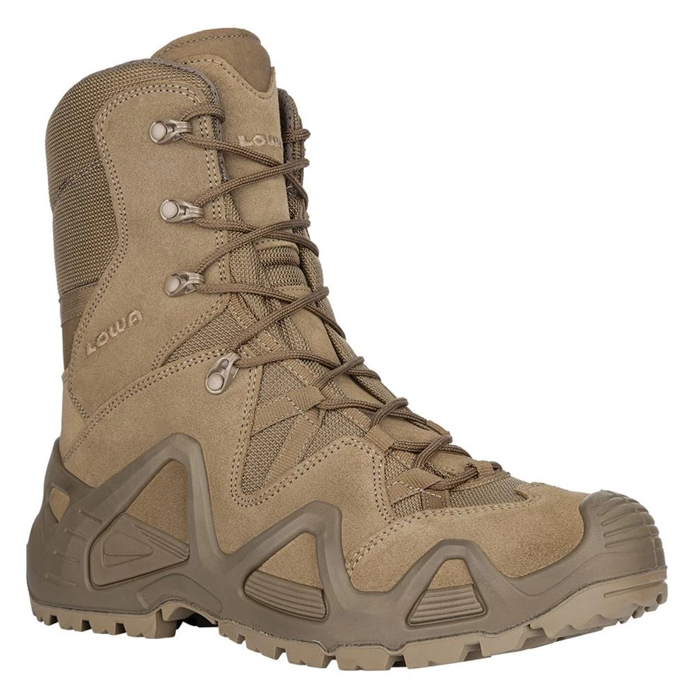 Designed to answer the need for faster, lighter footwear that can handle the most punishing conditions, the Lowa Zephyr Hi TF boots will be your best friend in hotter weather. These desert boots have the comfort and performance that make them a favorite among service personnel. These boots are water resistant but not waterproof. They feature a quick drying fabric lining, as well as a climate control footbed for optimum comfort when the temperatures rise. The PU Monowrap frame works with the DuraPU midsole to provide long-lasting support, stability and rebound. A durable split leather and Cordura fabric upper is strong and long lasting. The Lowa Zephyr Hi TF is a lightweight, tall-shafted, breathable desert boot that will stand up to rugged use.
