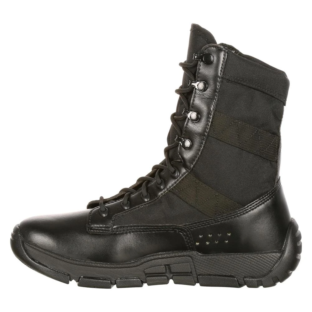 Engineered for military training programs, the ultra-light Rocky 8″ C4 Trainer is a heavy-duty military boot with an athletic fit and high flexibility. The leather and nylon upper can withstand constant abuse and will not let you down no matter how hard you train. The Air-Port polyurethane footbed absorbs shock in the heel and forefoot for much softer landings and provides comfort during extended periods of wear. The EVA and rubber outsole is relentlessly durable and can handle any terrain with optimal grip and traction. It is slip, oil, heat, abrasion and water-resistant, so it will perform in all climates. Ventilation holes on the sides of the boot promote breathability and ensure a cool, dry environment within the boot. A reinforced stitched toe guard offers added protection.