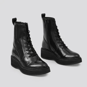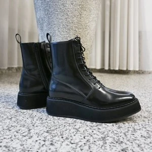 Combat boots with almond-shaped toe and lightweight EVA platform sole. They feature lace-up closure with exposed zip at side and pull tab on back. Leather insole.