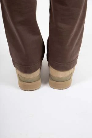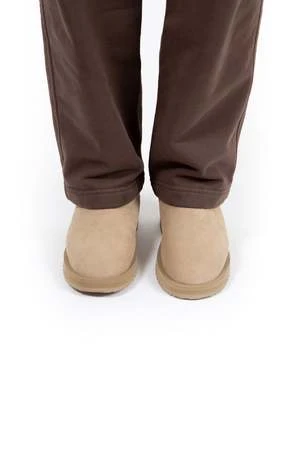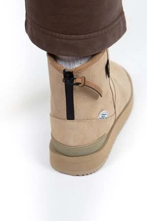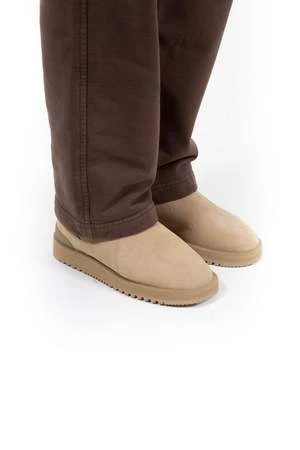 Beige suede ankle boots featuring shearling lining, round toe, rear zip fastening, ridged rubber sole, ankle-length and embossed OVO branding over the upper.