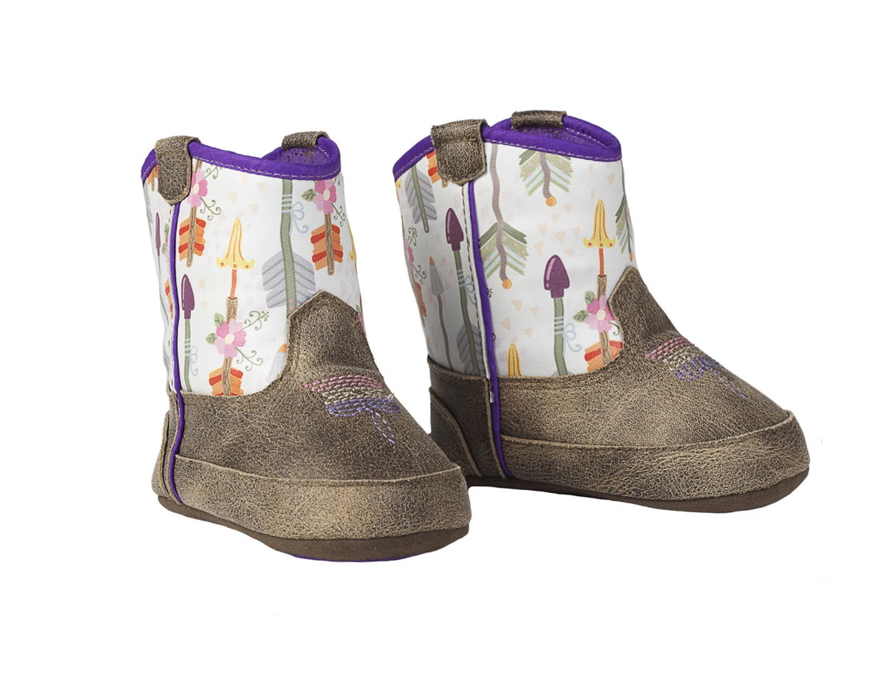 Your little one is sure to be a charmer with these Blake baby bucker boots by M&F Western Products. Flower print shaft that is decorated with purple piping and boot pulls. Side Velcro closure for easy on/off. So comfortable that your little cowpoke will want to wear them all day.