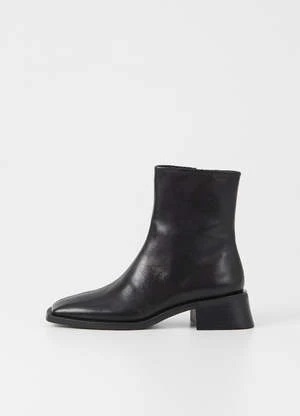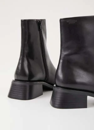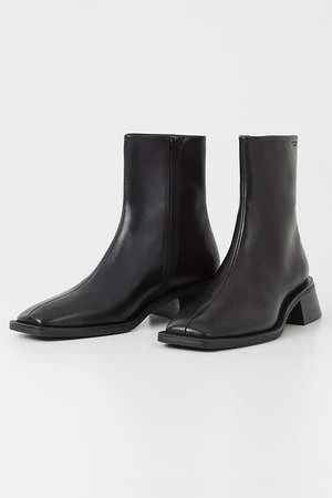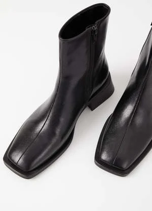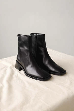 Vagabond Blanca square toe boots in smooth black leather. The leather upper is set on contrast-colored outsoles, complemented with flared block heels for a contemporary look. The square toes and mid-shaft provides a modern, refined take on a classic style. Details include zip-side fastening and visible seams along the front.