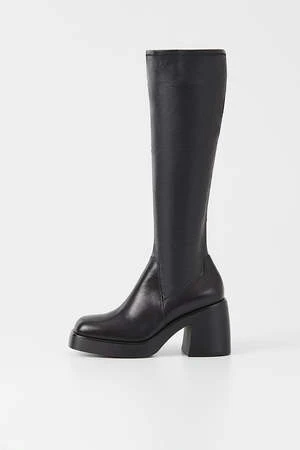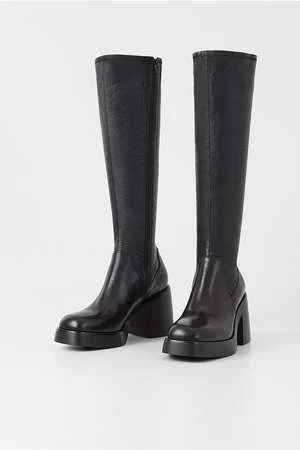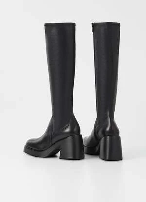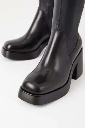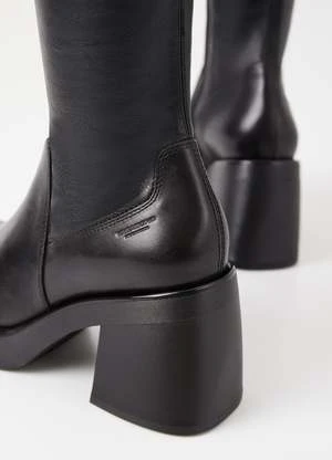 Vagabond Brooke knee high tall black leather boots with platform. Retro-inspired design is crafted from black leather featuring a stretchy shaft, square toes and inside zippers. The chunky rubber outsoles is paired with 87mm block heels.
