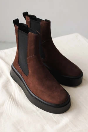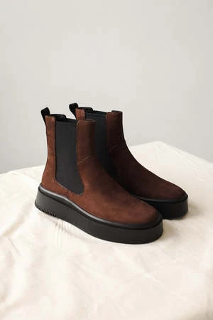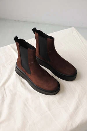 Vagabond Stacy chelsea inspired suede boots in chocolate brown. Round toes, flatform sole, elastic side panels and pull-on tabs.